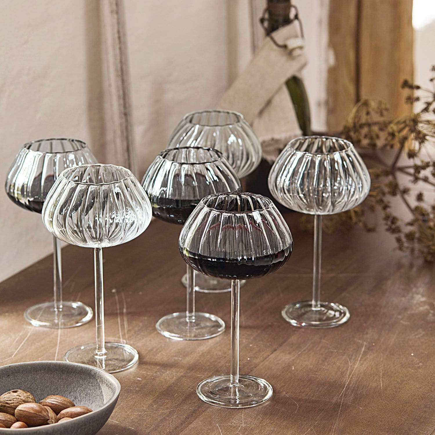 Wunderschönes mundgeblasenes bauchiges fein geriffeltes Weinglas aus dem Hause Loberon. Ein eleganter Eye-Catcher an jeder gedeckten Tafel.